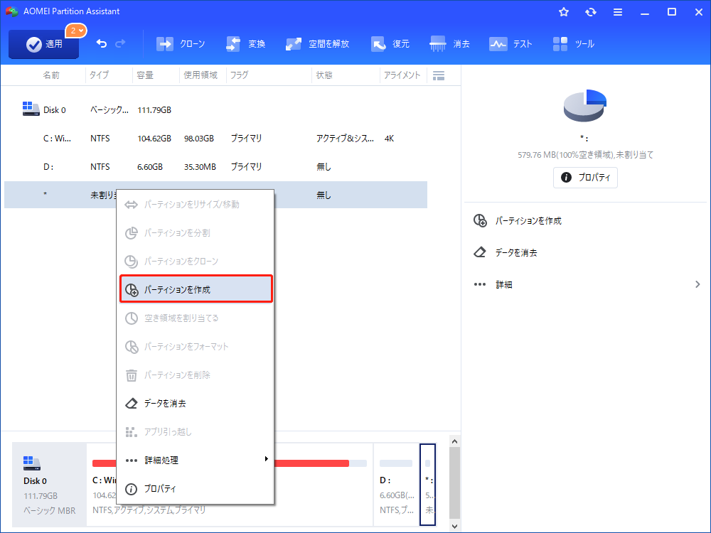 対象パーティションを右クリックして「パーティションを作成」を選択します。