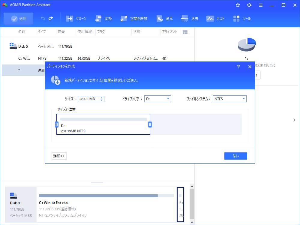 最後は紹介したい機能は「パーティションを作成」です。この機能も新しいパーティションを作成できます。未割り当てだけでなく、既存パーティションの上に新しいパーティションを直接作成できます。