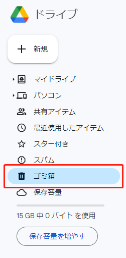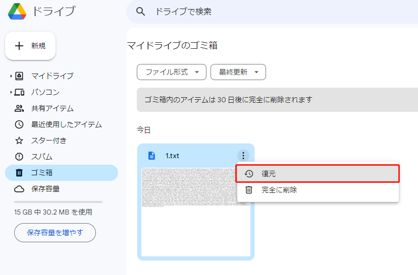 前述のように、Googleドライブで削除されたファイルは、通常まず「ゴミ箱」に移動し、30日間保管されます。そのため、まずはファイルがゴミ箱に残っているかどうかを確認しましょう。