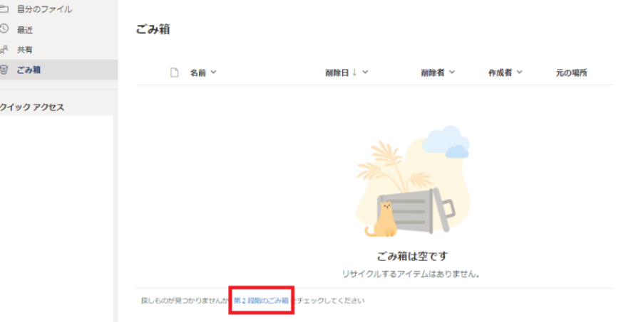 前述のように、法人向けMicrosoft 365アカウントには、さらに「第2段階のごみ箱」があります。ごみ箱に見つからない場合は、ページ下部の「第2段階のごみ箱」をクリックしてください。第2段階のごみ箱では最大93日間復元できます。