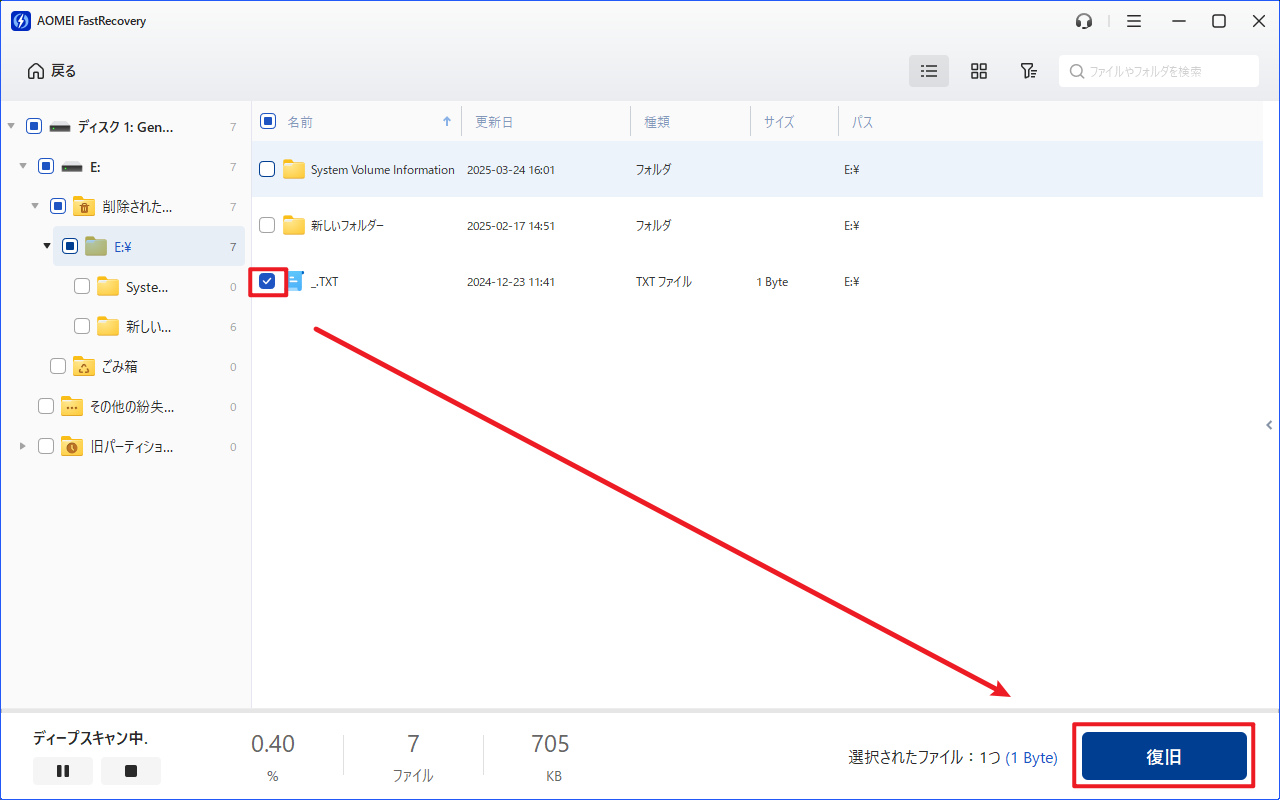 ステップ 3. 復旧したいファイル/フォルダを選択し、「復旧」をクリックし、保存先を選択して復元します。