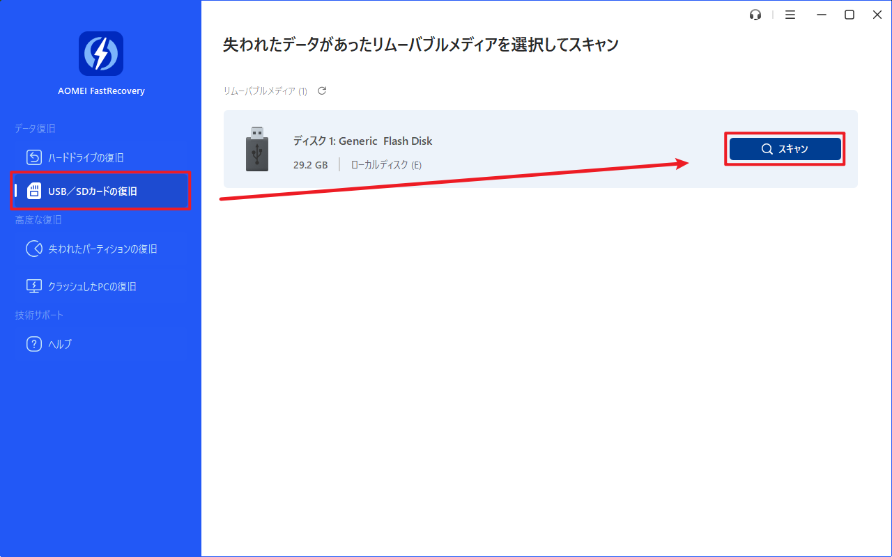 ステップ 1. SDカードをカードリーダーに挿入し、カードリーダーをPCに接続し、パソコンに検出できることを確認します。AOMEI FastRecoveryを開き、「USB/SDカードの復旧」タブをクリックし、マウスを接続したSDカードに移動し、「スキャン」をクリックします。