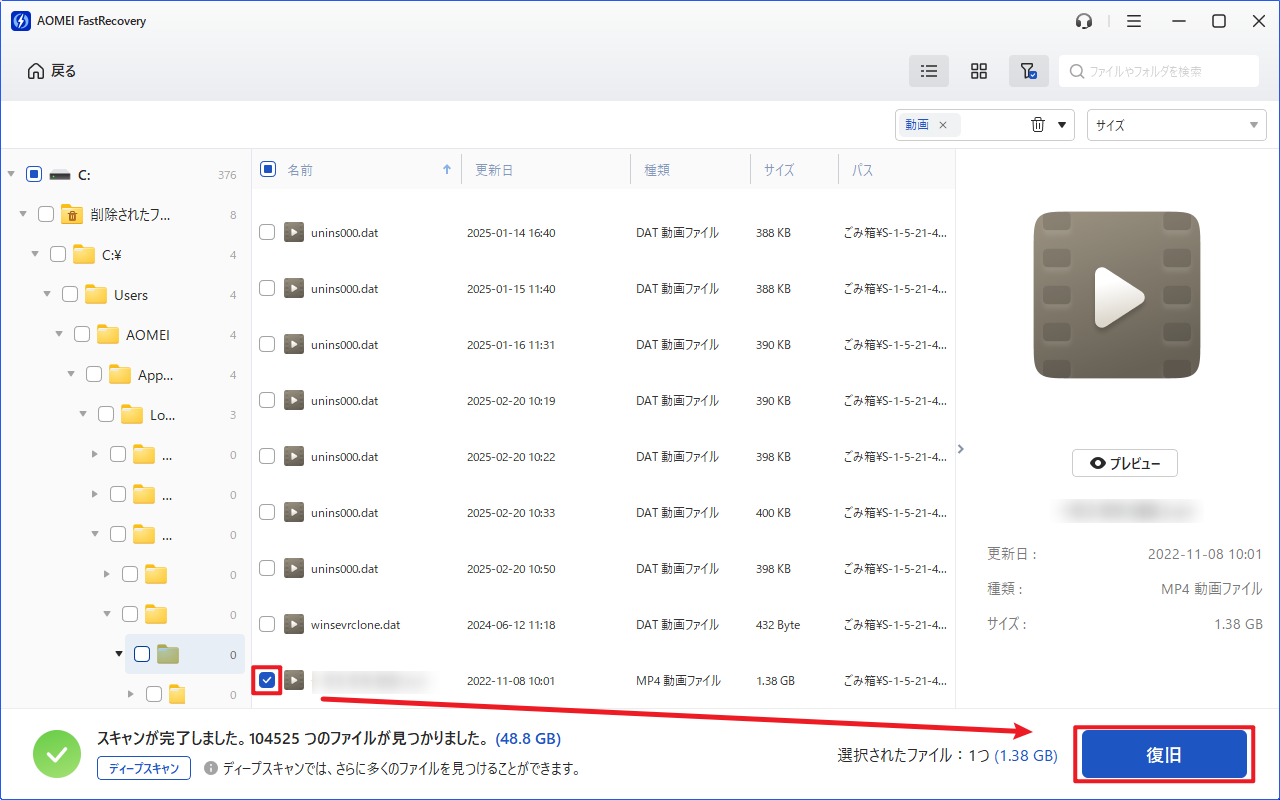 ステップ 3. 復元したい動画を選択し、「復旧」をクリックし、保存先を選択して復元します。*復元したいファイルが見つからなかった場合、左下にある「ディープスキャン」をクリックしてディープスキャンを行ってください。