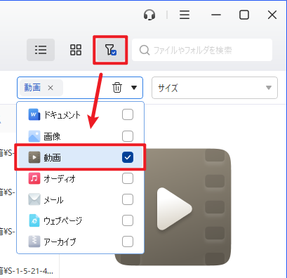 ✍ヒント:復元するファイルをより速く見つけたい場合、「フィルタ」を利用することができます。この機能を使えば、種類、サイズによってファイルをフィルタリングすることができます。また、ファイル名や拡張子を覚えている場合、直接検索バーで検索することもできます。