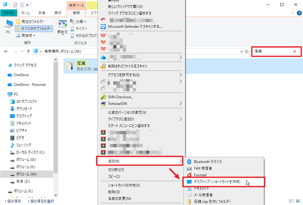 見つかったら、右クリックで「送る」→「デスクトップ(ショートカットを作成)」を選択するか、コピーしてデスクトップに貼り付けます。