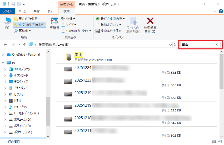 Windowsの検索機能を使って、SDカード内に残っているファイルを直接探す方法です。ファイル名や拡張子がわかっている場合に有効です。