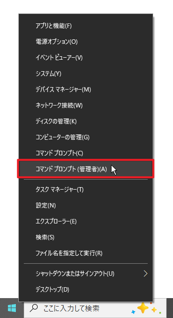 1. スタートアイコンを右クリックし、「コマンドプロンプト(管理者)」を選択します。
