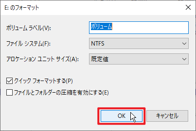 3. ファイルシステム(例:NTFS または FAT32)を選択し、「クイックフォーマット」にチェックを入れて「OK」をクリックして実行します。