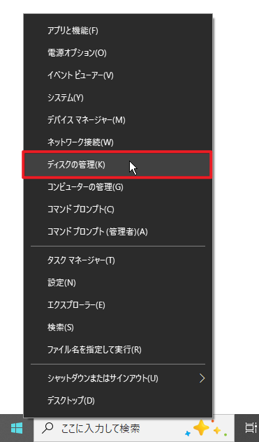 1. スタートメニューを右クリックし、「ディスクの管理」を選択します。