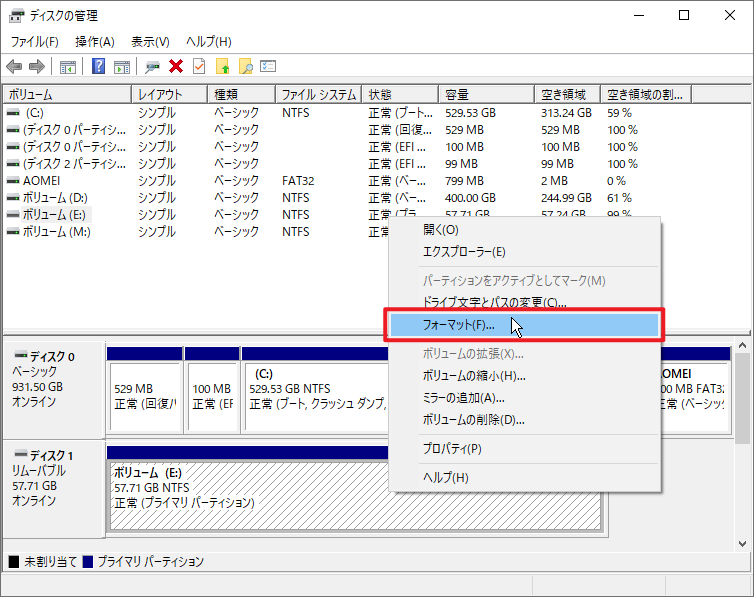 方法2:「ディスクの管理」でUSBメモリをフォーマットして修復する