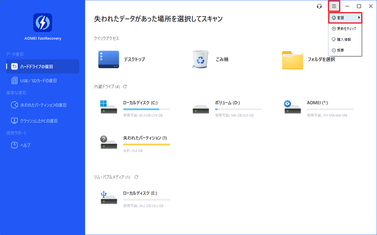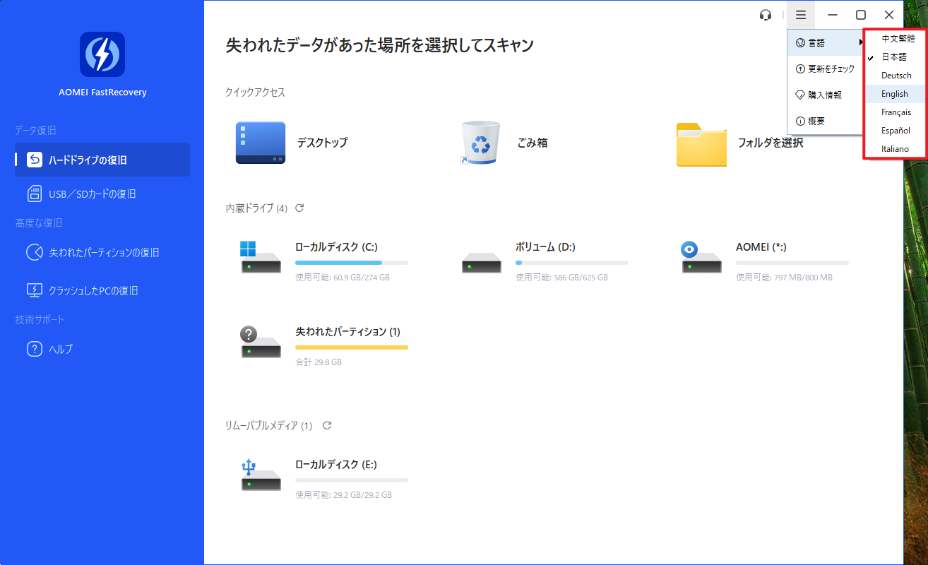 現在、AOMEI FastRecoveryは複数の言語に対応しています。対応言語には、日本語、英語、ドイツ語、フランス語、スペイン語、イタリア語、繁体字中国語があります。以下は、言語を変更する手順です。