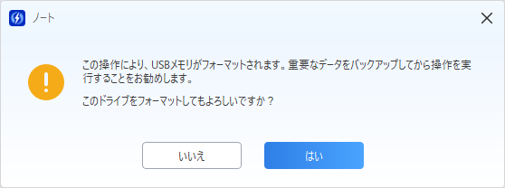 ステップ 3. 方法を選択して進めると、警告ウィンドウが表示されます。USBフラッシュドライブはフォーマットされ、すべてのデータが削除されます。重要なデータがある場合は、事前にバックアップを取ってください。確認したら、「はい」をクリックして続行します。
