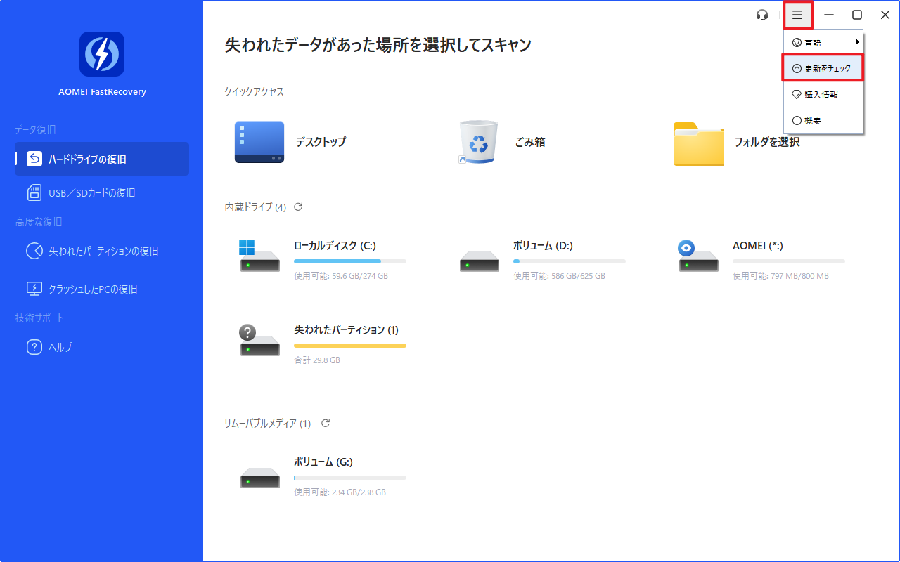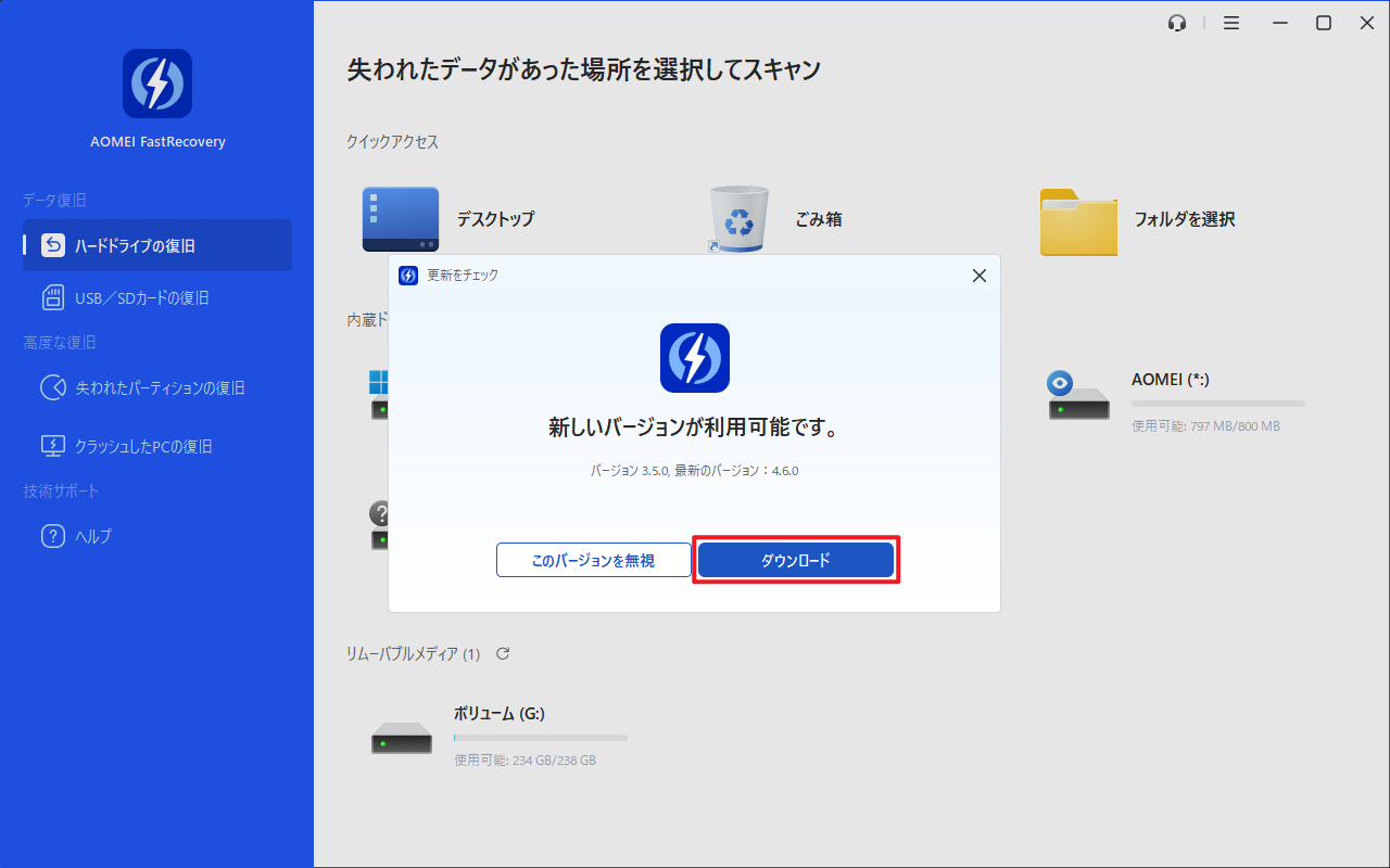 AOMEI FastRecoveryは定期的に更新されます。新しいバージョンでは、既存の機能が最適化されたり、新しい機能が追加されたりします。新バージョンをすぐに体験したい場合は、バージョンの更新を行うことができます。