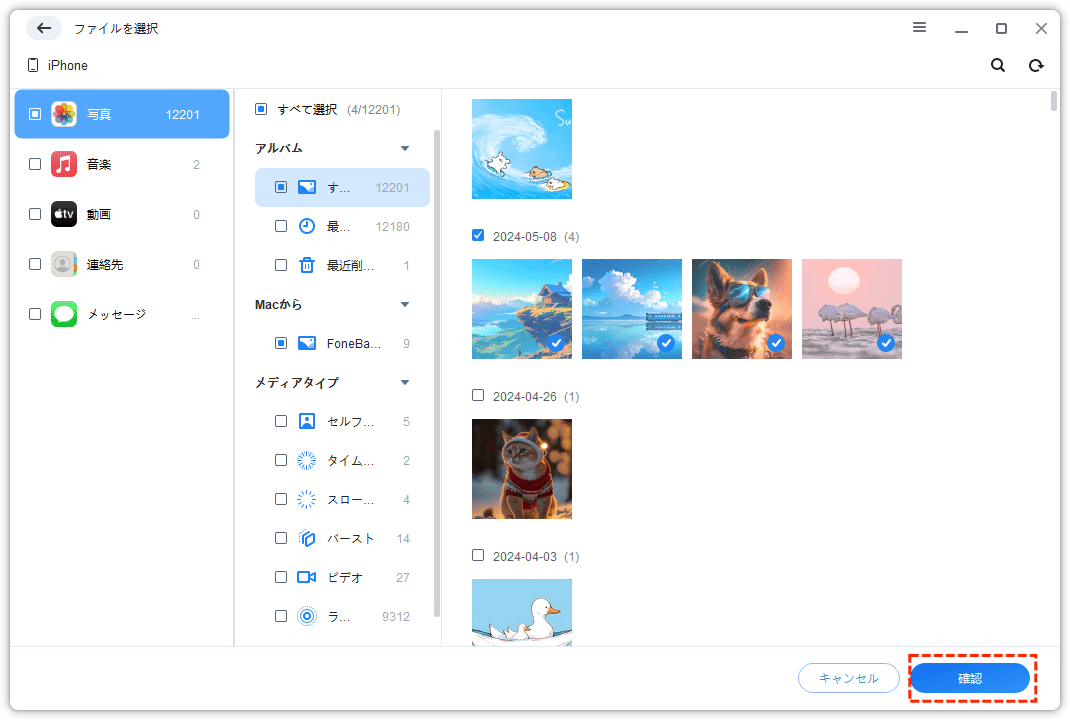 手順3.各アイコンをクリック>具体的なファイルをプレビューして、新Apple IDを使用するiPhoneに保存したいデータを選択>「確認」をクリックします。