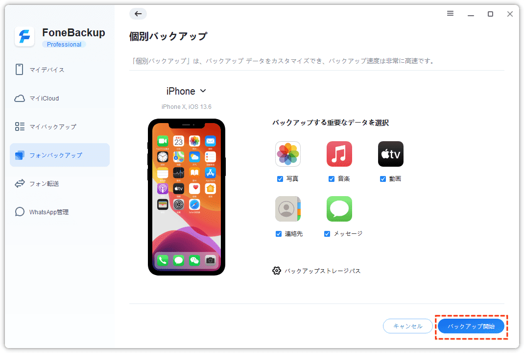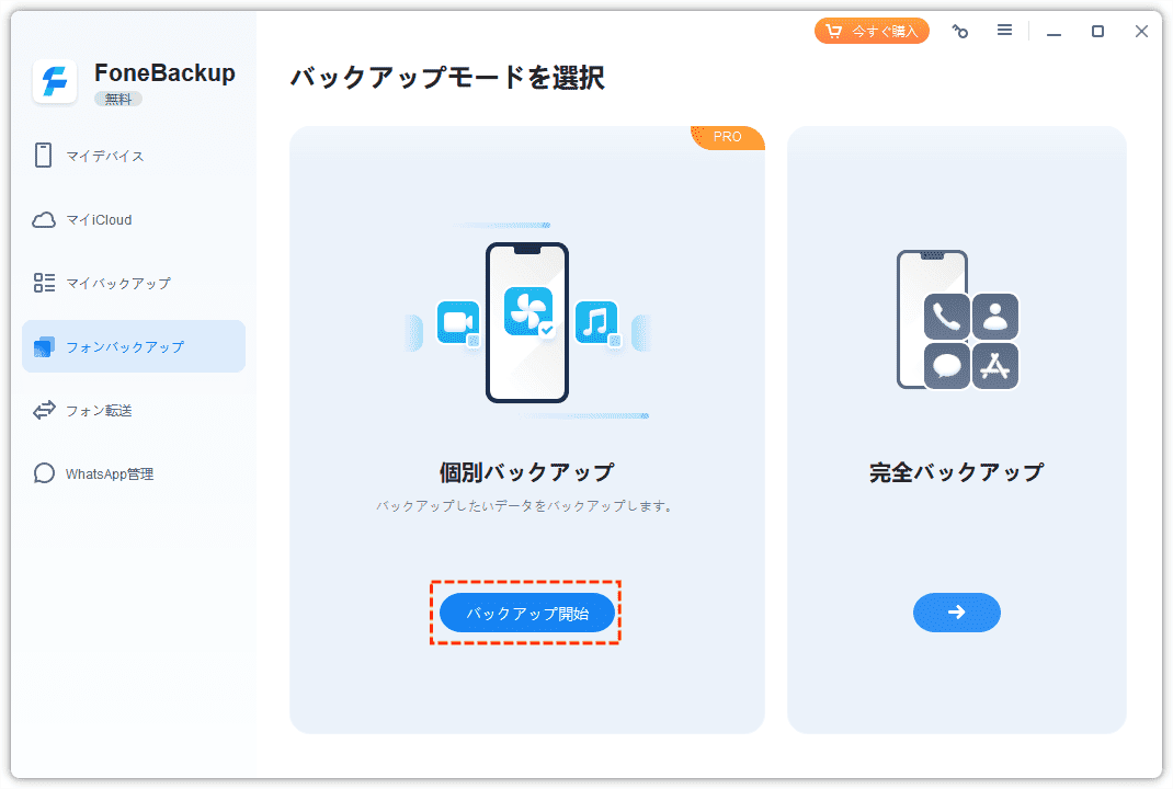 手順2.FoneBackupを起動>「フォンバックアップ」タブに移動>必要に応じて、「個別バックアップ」、または「完全バックアップ」を選択>「バックアップ開始」ボタンをクリックします。