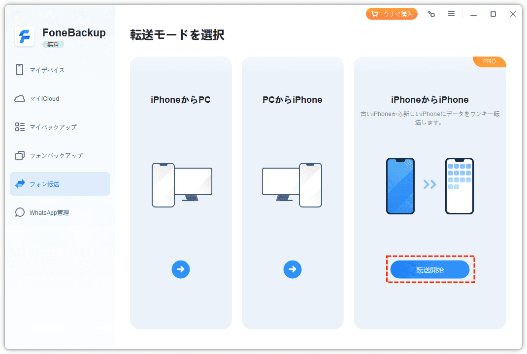手順2.FoneBackupを起動>「フォン転送」タブをクリック>「iPhoneからiPhone」を選択>「転送開始」をクリックします。