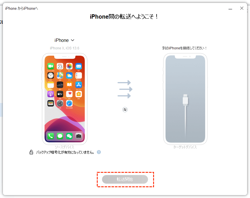 手順3.両方のiPhoneが正しく認識されているのを確認>「転送開始」をクリックします。