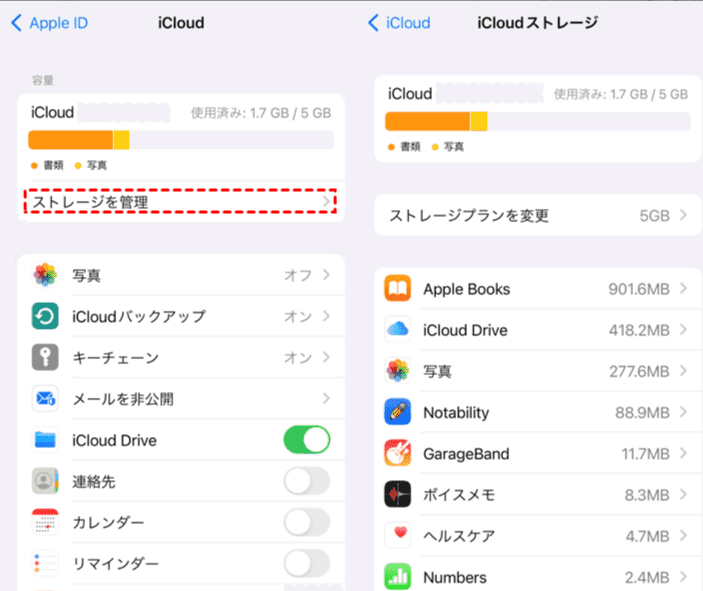 手順1. 「設定」→上部の自分の名前→「iCloud」→「ストレージを管理」の順にタップし、現在の使用状況を確認します。