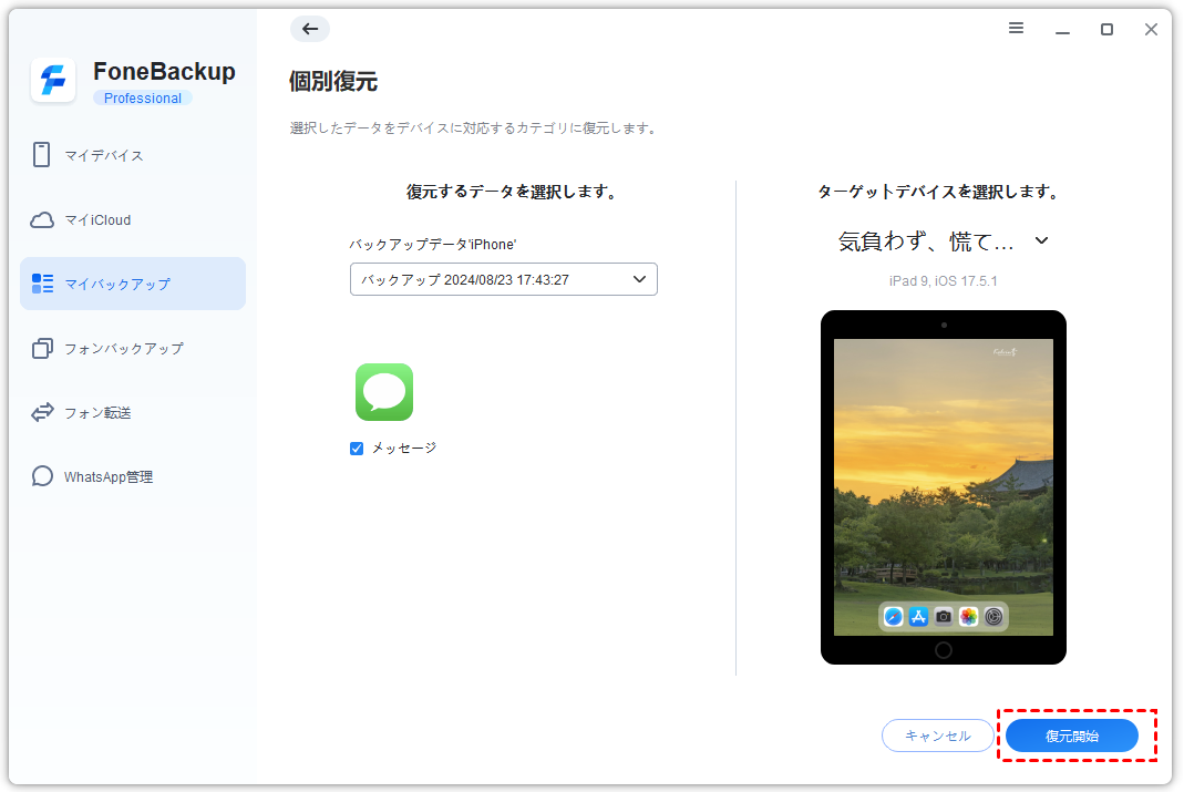 手順3.復元するバックアップファイルと復元先(新しいiPhone)を指定し、「復元開始」をクリックします。