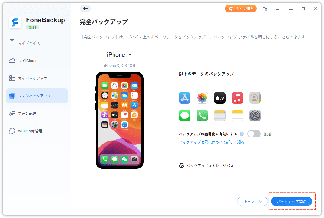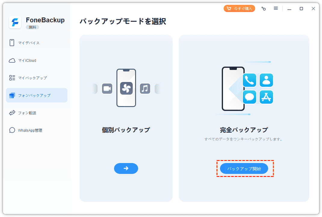 手順2.「フォンバックアップ」→「完全バックアップ」→「バックアップ開始」をクリックします。